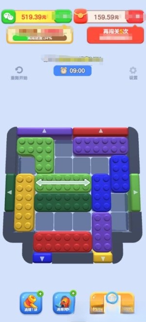 1.一开始先从简单的关卡玩起,慢慢解锁新的场景,每关都有不同的目标,比如消除一定数量的积木或者取得高分。
