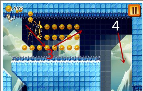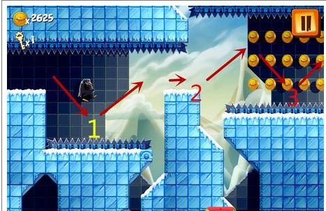 1当企鹅下落到位置1处时,用手指在屏幕上向上滑动,使企鹅跳上小平台。