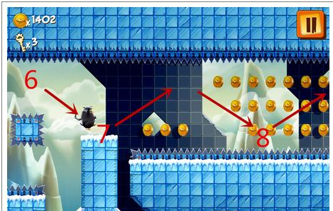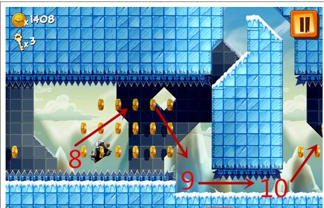 8. 最后一步,用手指在10号位置的屏幕上快速向上滑动,使企鹅跳到上方的平台,恭喜你,终于通关啦!