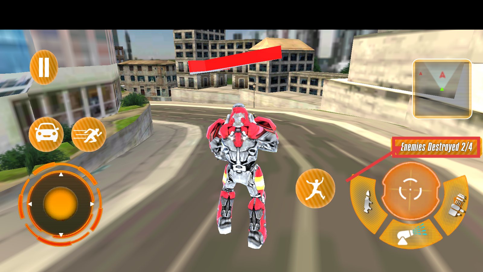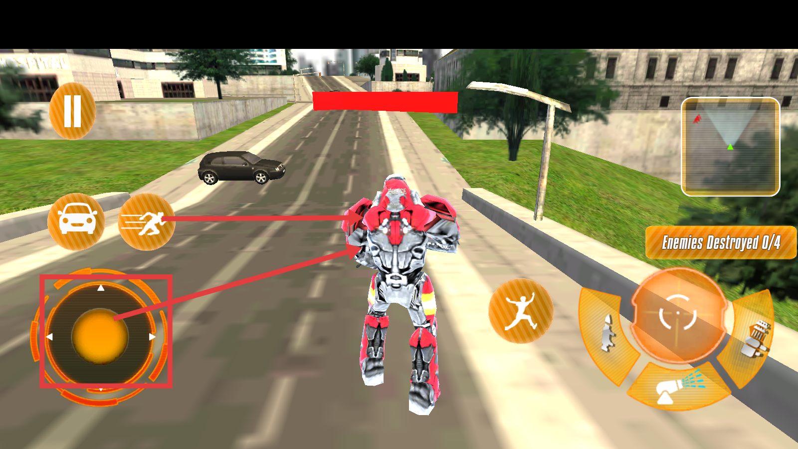 2. 在城市道路场景中,借助左侧轮盘来操控机器人移动,并利用技能按钮作为辅助,做好迎战敌人的准备。