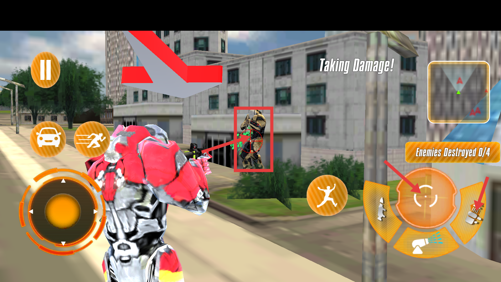3、当察觉到敌方机器人出现时,点击右侧的攻击按钮展开攻击,同时留意【Enemies-Destroyed-0/4】的杀敌进度,按部就班地将敌人逐个消灭。