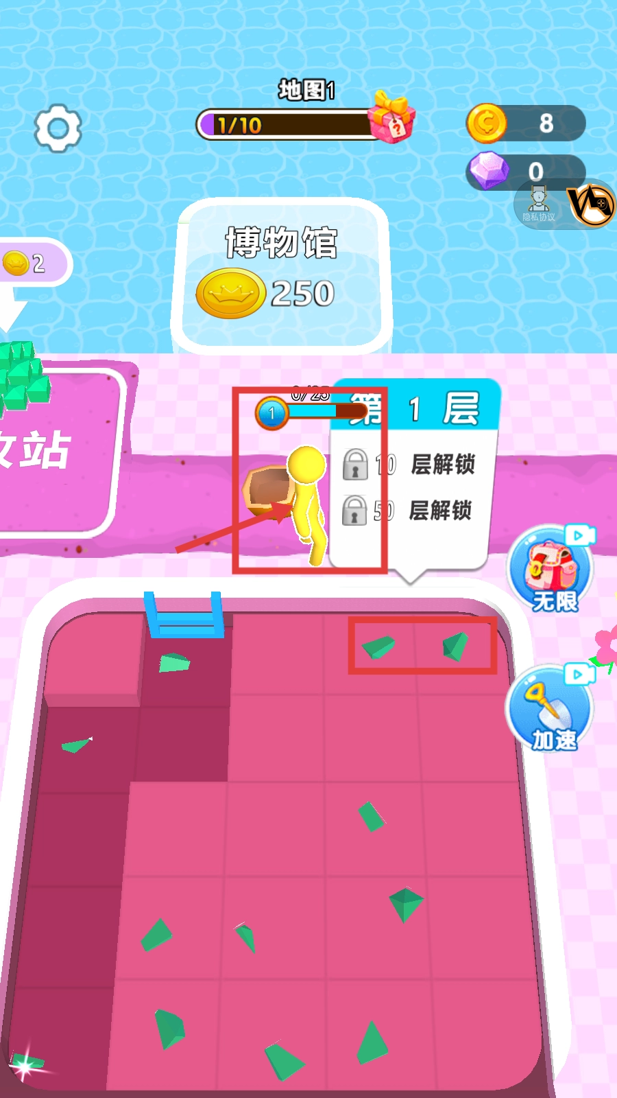 1. 在【地图1 - 第1层】,控制黄色小人使用工具挖掘绿色矿石,以此积累资源。期间,你能够查看【博物馆 - 250】的金币目标,从而熟悉挖矿操作。
