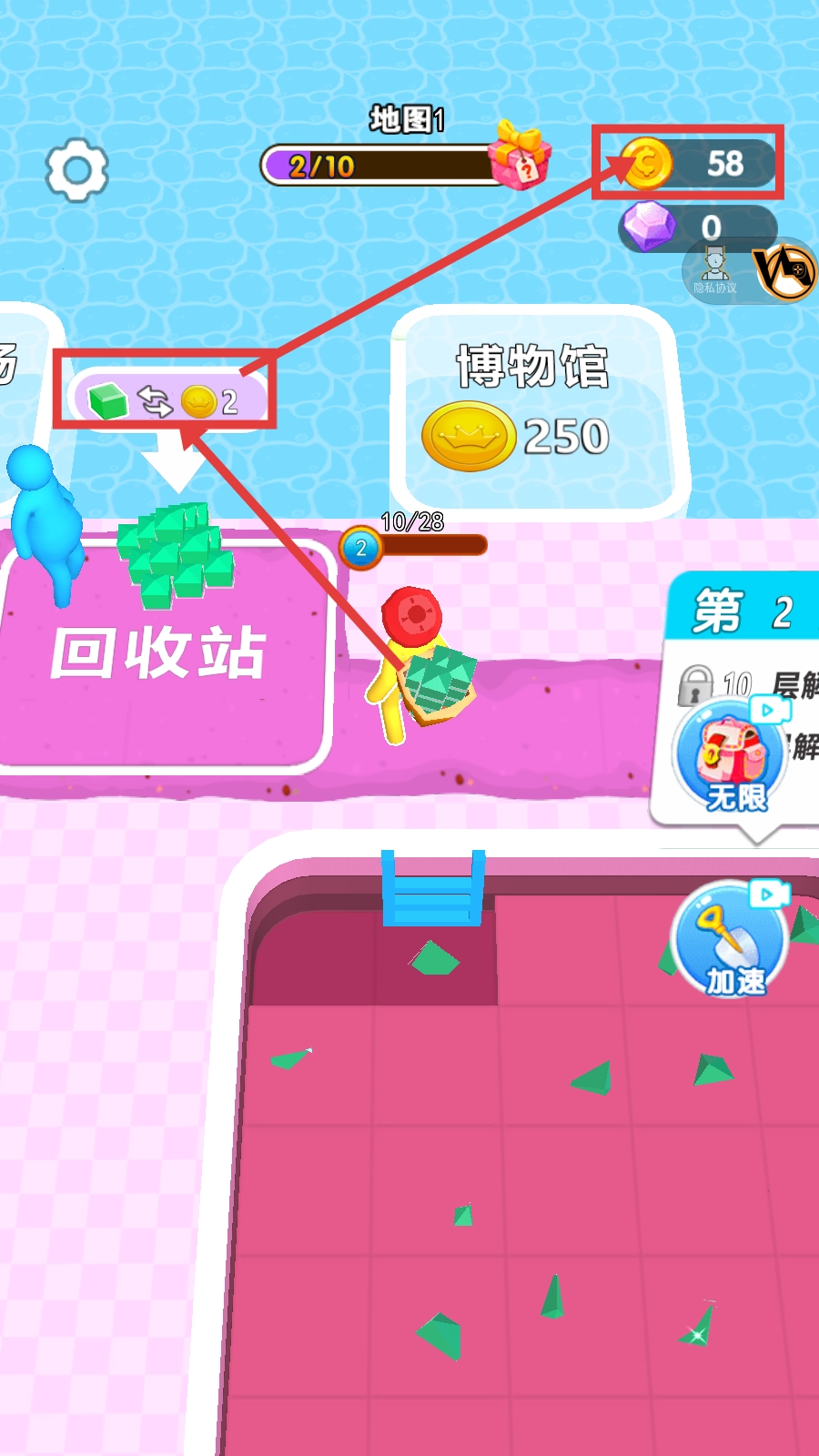 3、把矿石送至【回收站】,用以兑换金币,例如【绿色方块 - 可兑换2金币】,持续积累金币直至达到【58】,以此提升资源储备。