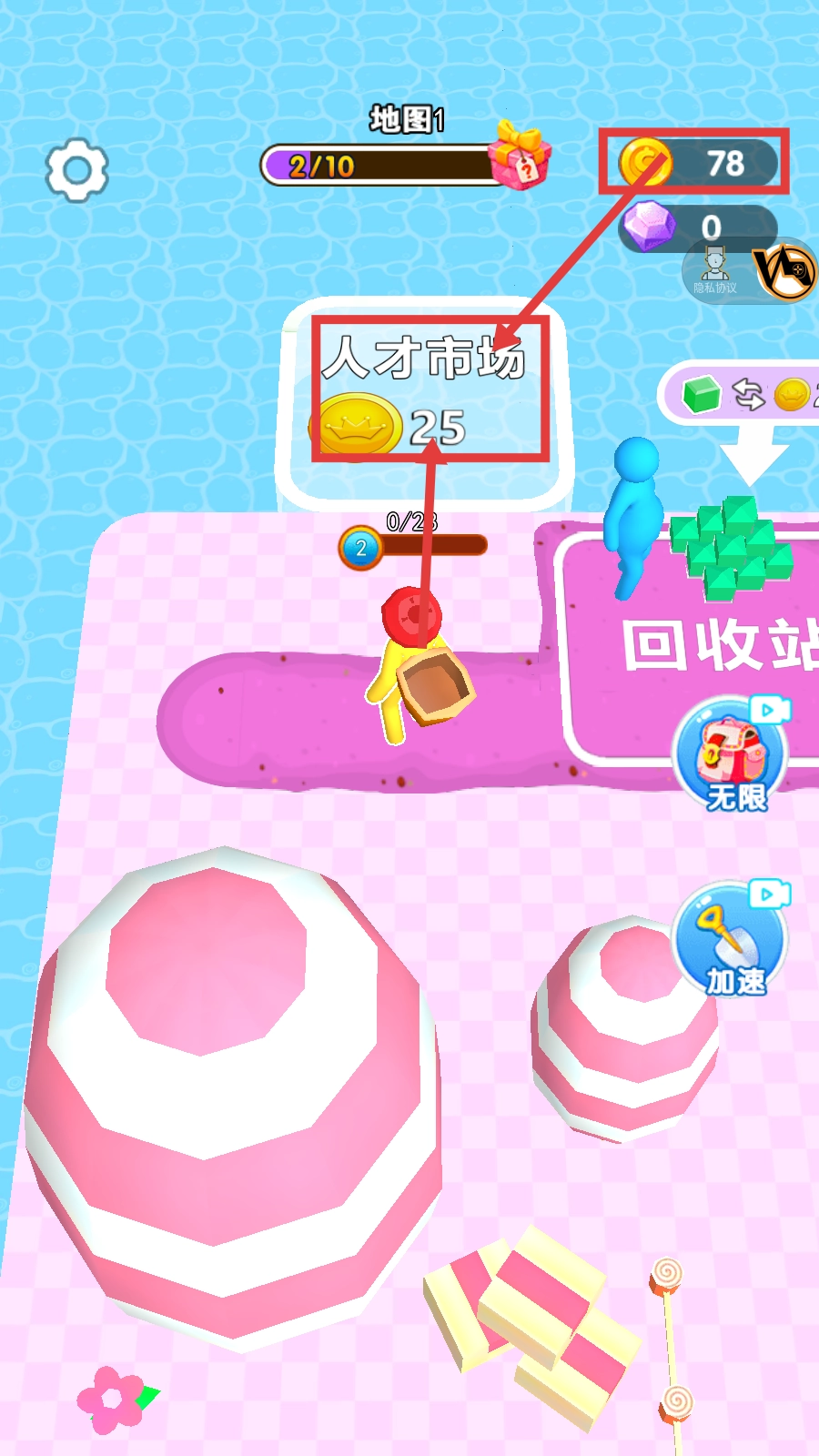 4、前往「人才市场」,耗费「25」金币来解锁功能,把金币积累到「78」,推动游戏进程,解锁新的区域。