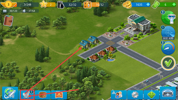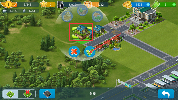 3、于地图上挑选合适的位置,点击对勾确认【侧楼】的放置,通过完成建筑布局来推进城市建设。