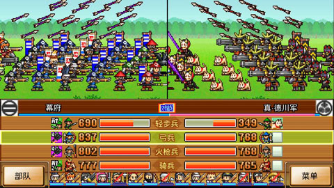 等打到这个阶段之后,相信大家对游戏的基本规律都掌握的差不多了。还是使用战术+耐性以及连击的打法。将角色安排在前面不但可以保存兵力,还可以对敌人造成更多的伤害。注意真德川的兵力全部都是750的,但是只要使用400左右的骑兵就可以冲散真德川750的骑兵了,还有幕府LV99也可以消灭掉,可以得到一件神装。