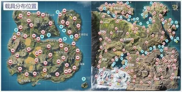 上图中红色车表示陆上载具的生成地方,陆上载具生成是随机的。蓝色船表示生成船只的地方。熟悉载具的位置非常重要,如果航线离理想的落地点较远,萌新想要到人少的地方搜一波,那就可以先选择落到载具身边,然后再开车去目标点,这是低风险高收益的最佳选择。