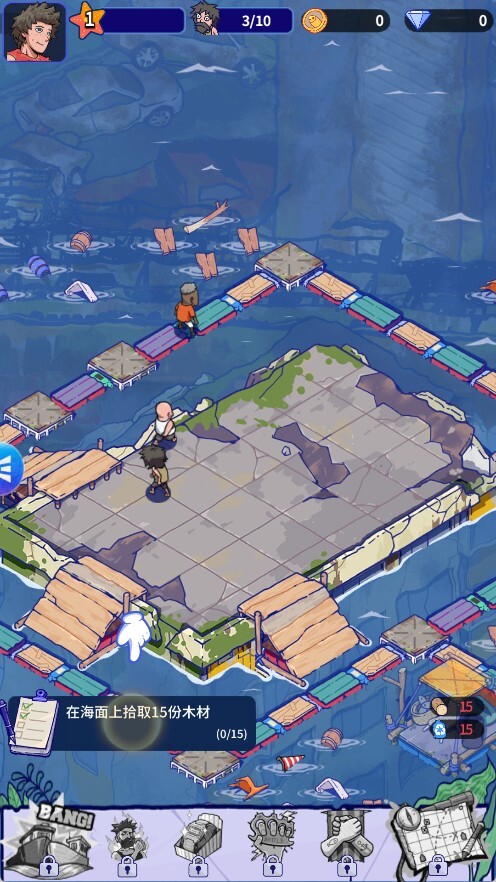 初始阶段资源少,第一目标就是收集漂浮资源,木板、绳索、金属、塑料。