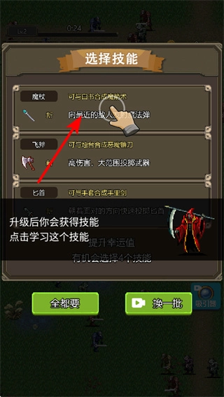 3、挑选技能时可选择像针技能这类,要留意技能的具体作用,比如能向靠近的敌人发射魔法弹,通过合理的技能选择来提高战斗的效率。