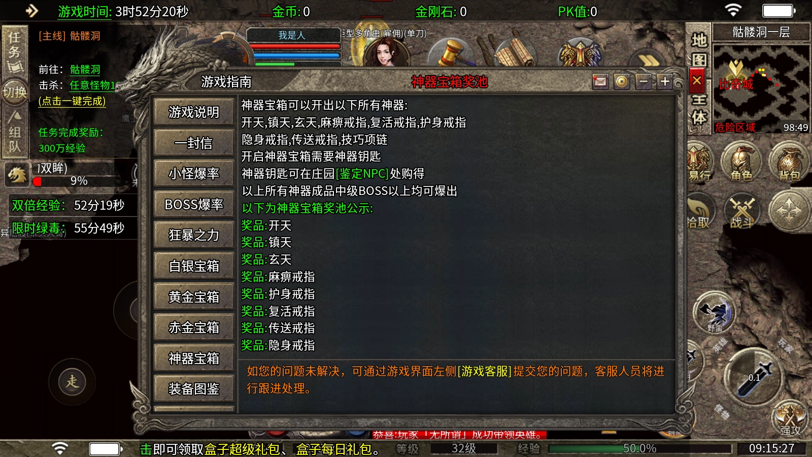 神器宝箱能够开出开天、镇天、玄天、麻痹戒指、复活戒指、护身戒指、隐身戒指、传送戒指以及技巧项链这些全部神器。