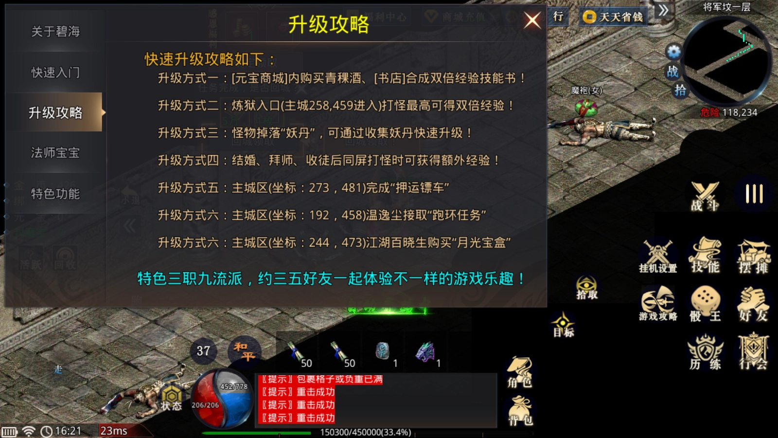 升级途径二:炼狱入口(可从主城坐标258,459处进入),在此处击杀怪物最高能获取双倍经验。