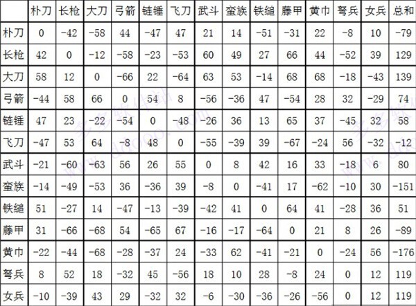 大体来说,长兵器克制短兵器,短兵器克制弓,弓则克制长兵器。长兵器的主要类别有长枪、大刀、链锤和铁缒;短兵器主要包含朴刀、武斗、蛮族、藤甲与女兵;弓的范畴里主要有弓箭、弩兵和飞刀。