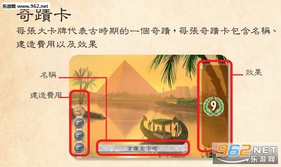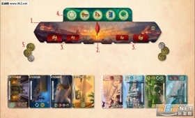 在这个版本中,奇迹板块被移除了,取而代之的是一张大型奇迹卡,卡牌上标注了建造所需的费用以及它能提供的功能。