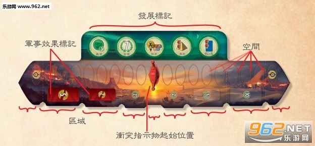 游戏版图划分为两个区域,其中包含游戏的军事效果标记与可用的发展标记。版图两端的最后一个空间各对应一名玩家。