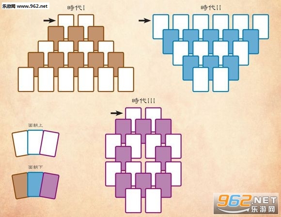 时代牌此次采用特殊的摆放方式呈现,每个时代配备20张卡片,具体摆放形式详见图示: