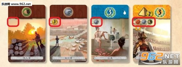 时代卡牌采用上下分离的设计,左侧标注建造花费,顶端呈现卡牌效果(熟悉七大奇迹玩法的玩家能快速上手)。