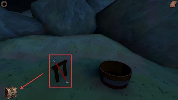 2、随后在场景里,按照箭头的提示,将木架上的道具拾取到背包中,以便为后续的解谜环节做好准备。