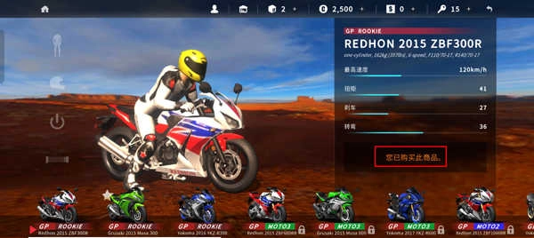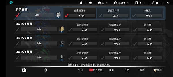 3、新人玩家建议首先体验单机赛事模式,从新手赛事到moto3、moto2、moto1赛事,游戏难度逐渐提升,可让玩家更为系统的掌握驾驶摩托的技巧