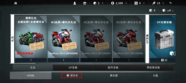 2、下方有好几个选项可以选择,我们点击选择摩托车,然后购买其他摩托车就可以换车了;