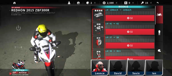 2、这里有最高速度、扭矩、刹车、转弯都可以花金币进行升级。