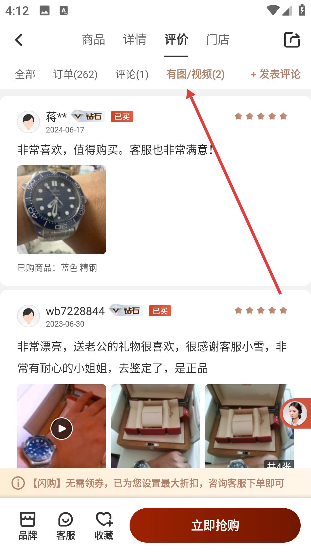3、在腕表详情页面点击评价选项,进入评价页面,查看其他买家的评论,包括有图,视频的评价,了解大家对这款腕表的使用感受。