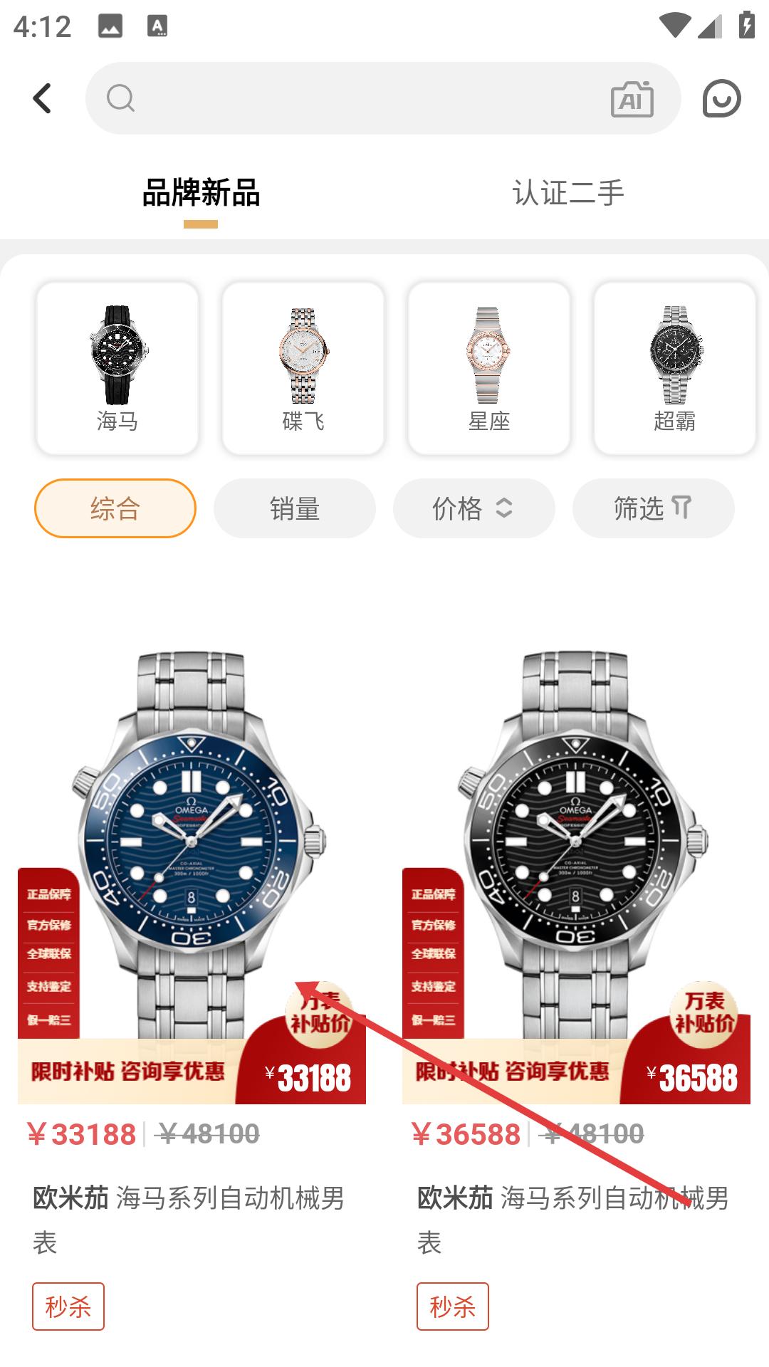 1、进入品牌新品页面,可看到海马、碟飞等系列腕表,还能按综合、销量、价格等排序,挑选心仪的欧米茄海马系列自动机械男表。