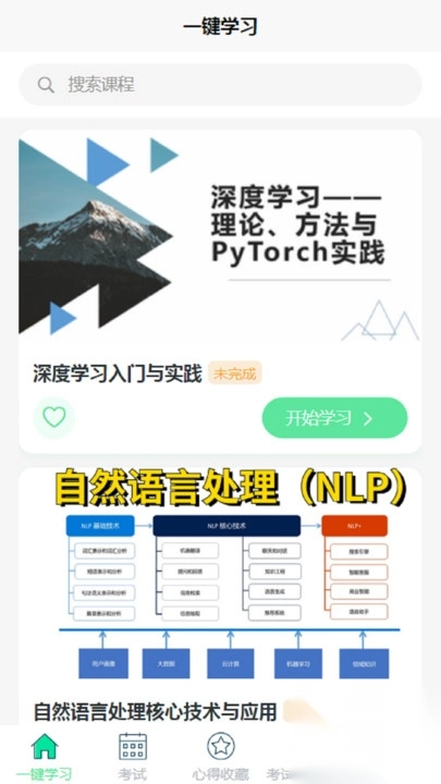 2. 涵盖一键学习、考试测试、错题重答、学习记录、学习统计以及心得查看与收藏等功能。