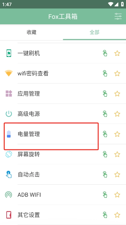 Fox工具箱官方版具备多项实用程序功能,包含充电测试、自动分接、ADB无线连接、屏幕方向锁定,以及MIUI全屏手势与虚拟键切换等。此外,它还拥有电量图标美化功能,不过该功能仅改变电量图标的样式,并不会对实际用电情况产生影响。