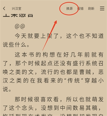 2、确认开始阅读后,轻点小说阅读页面的屏幕中央,唤起功能列表,接着点击右上角的“换源”功能,就能更换小说的书源地址。