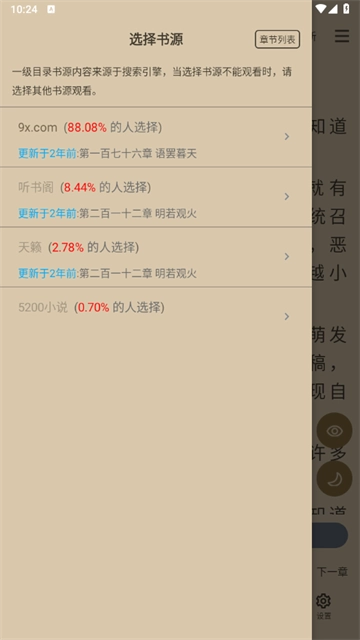 3、如此,用户仅需在选择来源的页面中,找出更新速度快的书源网站,点击即可完成换源操作,进而享受优质的阅读体验。