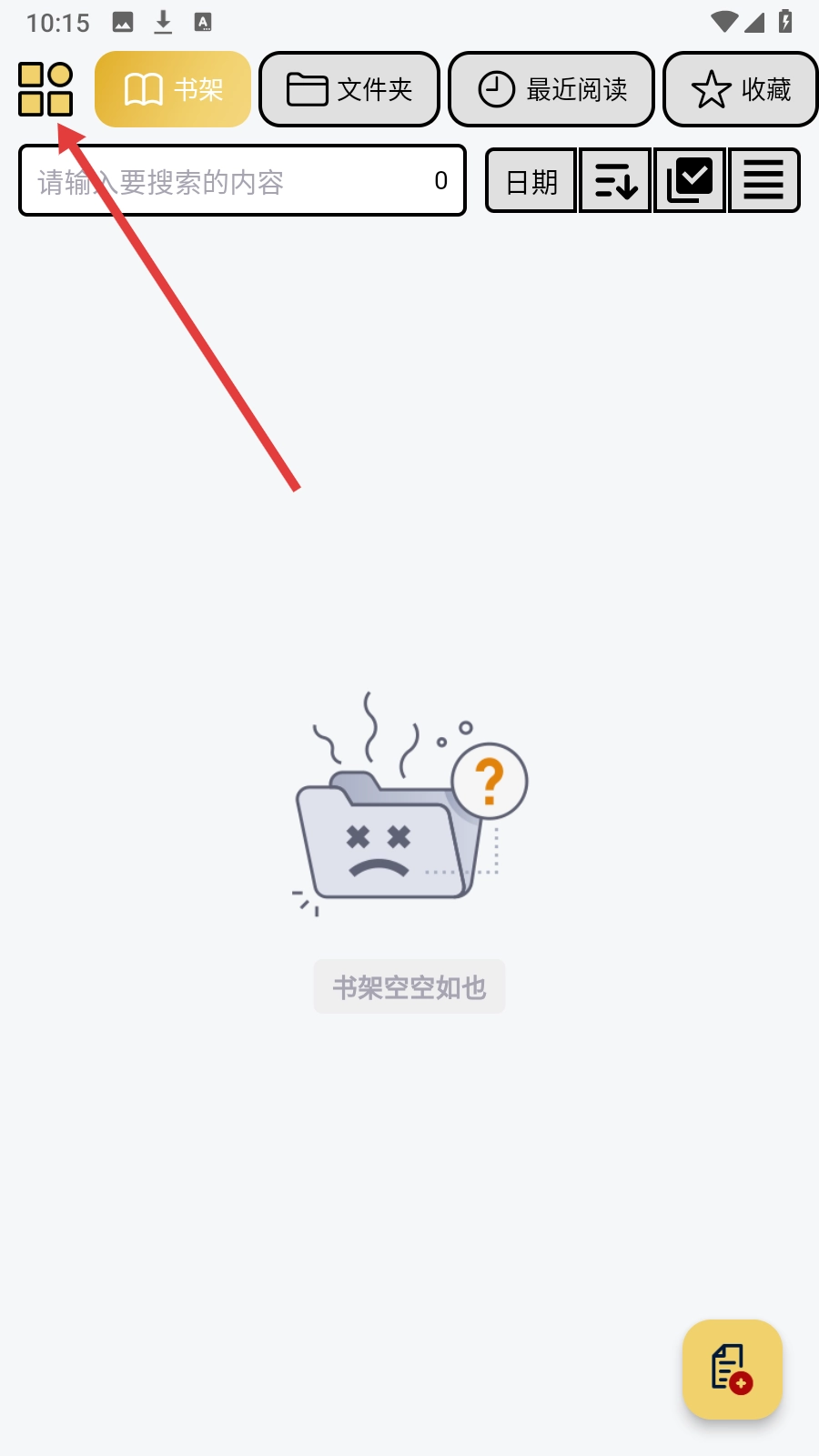 1. 在书架页面,点击左上角的【方块图标】,即可展开功能菜单。