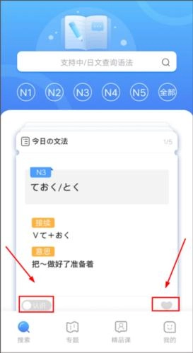 每日为您推荐日语语法学习内容。在此页面,用户能够依据自身学习状况,点击下方的认识图标与收藏图标,借此判断自己对语法的掌握程度。