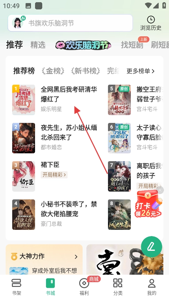 1、在书城推荐榜选全网黑后我考研清华爆红了,进入阅读页。