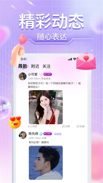 【同城交友】优先呈现附近的人,助你结识新朋友。在同城,无论是看电影、吃饭还是去旅行,都无需再独自进行。