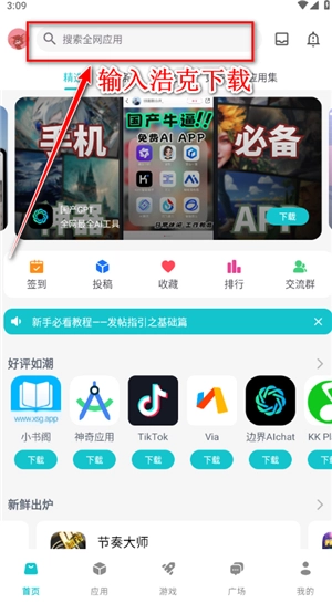 神奇应用的使用方法 1. 举例来说,假设我们打算使用浩克下载这款软件,第一种方式是在首页上方的搜索框中直接输入“浩克下载”。