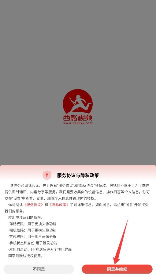 1. 初次启动西影视频APP时,务必认真阅读用户协议及隐私政策,点击“同意并继续”方可进入主界面。