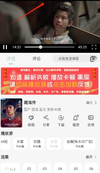 2、点击进入相应的播放界面,在这里,我们不仅能看到收藏、分享等一系列功能,还可以选择播放源和集数。