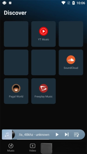 我们进入LarkPlayer当中,软件目前还不支持中文,默认英文,不过里面的操作并不难,和大家平时用的音乐播放器差不多,当我们刚进入到软件共有四个板块,音乐、视频、发现、我的。