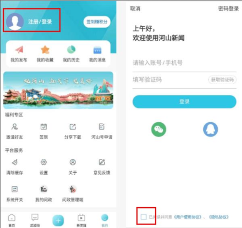 首先,打开“河山”新闻客户端,点击右下角的“我的”,注册并登录。可通过手机号+短信验证码方式登录,也可以通过微信、QQ验证手机号登录,如下图所示: