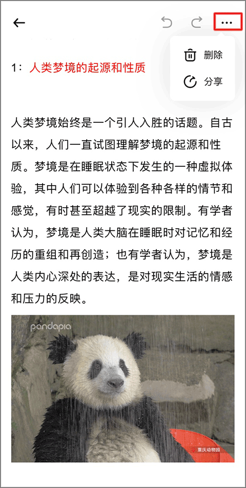 5、轻点右上角图标,能够实现文章的删除操作,也可将文章分享给好友。