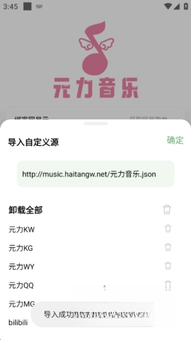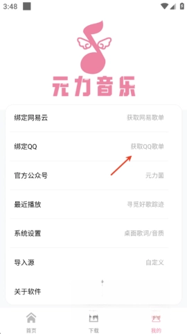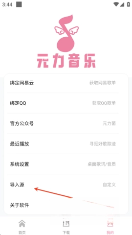 1、首先打开元力音乐,在“我的”页面里,轻松点击“导入源”。