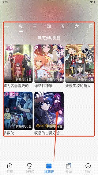 5、通过排期表,你能够了解每日动漫的更新动态,不仅包含实时更新的内容,部分老动漫的上架信息也会在此公布。