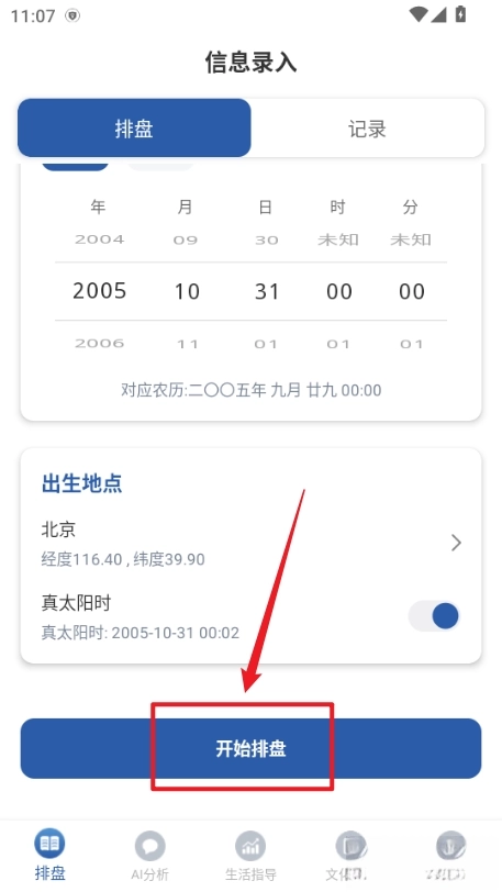 2. 信息填写完毕后,点击下方“开始排盘”。