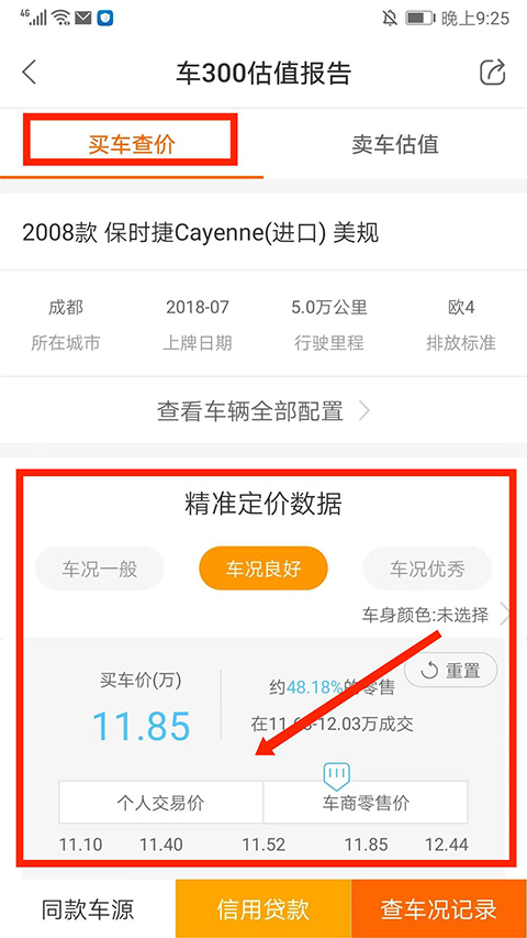 4、进入【卖车估值】页面,能看到当前车辆的卖车价格、车商收购价格以及个人交易价格。