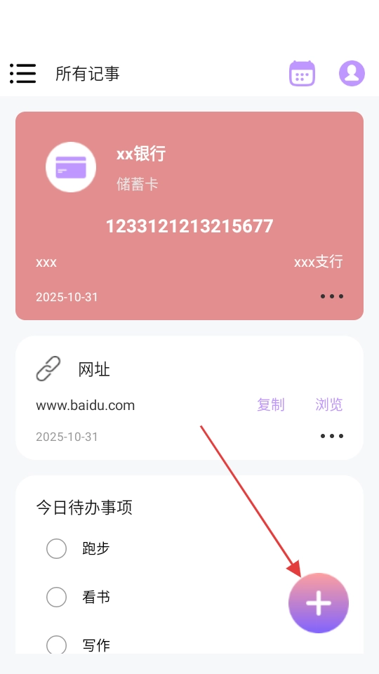 1. 在各个记事页面,点击右下角的紫色“+”号按钮,即可展开功能选项。