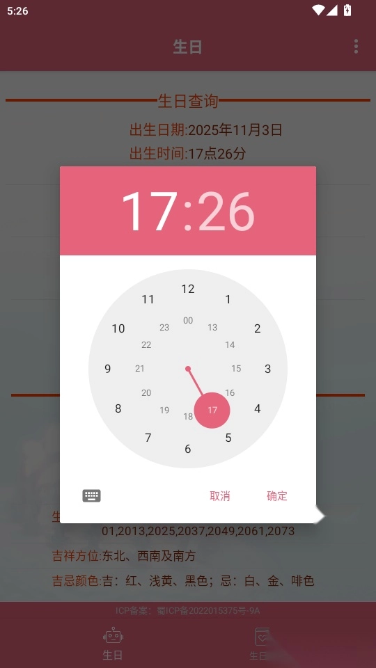 用户能够自由切换出生的日期与时间,切换完毕后可重新查询生辰信息以作了解。