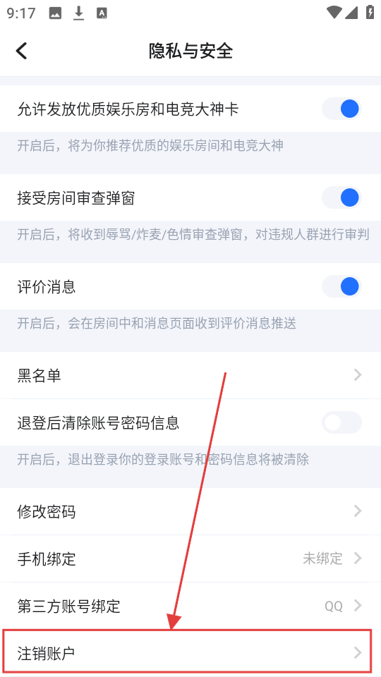 3、在隐私与安全页面点击【注销账户】,即可进入账号注销流程,若您有注销账号的需求,就从此处开始操作。