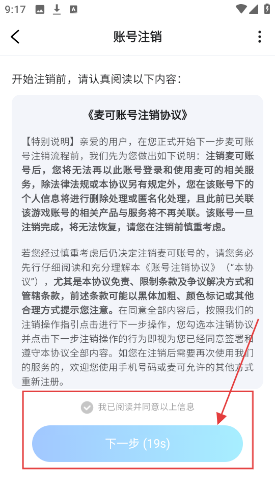 4、在账号注销页面,阅读并同意相关协议后,点击【下一步】,即可继续进行注销操作,是不是十分简单呢。