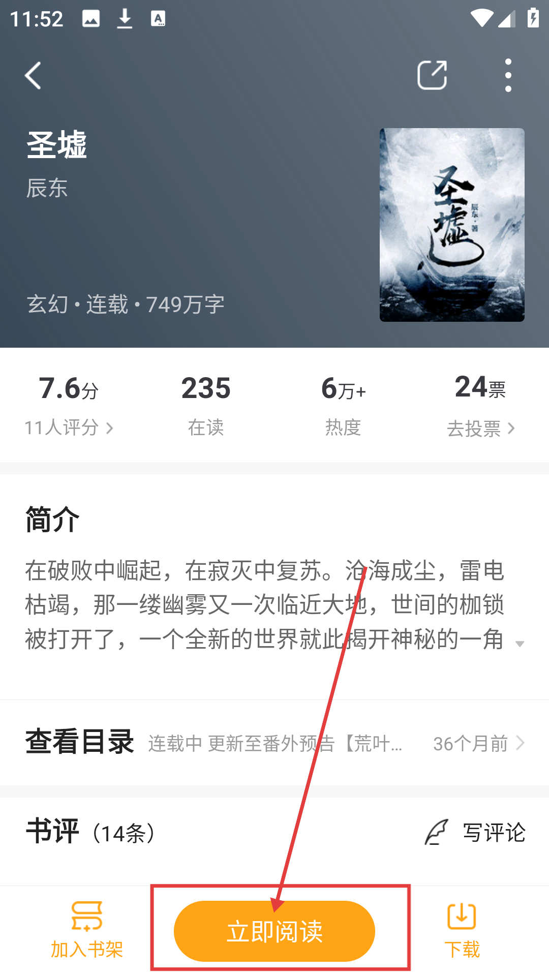 1、于《圣墟》详情页面,点击【立即阅读】,即可开启玄幻阅读之旅哟。