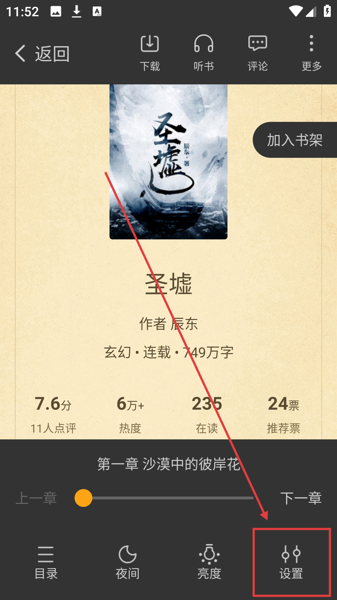 2. 当您进入阅读界面后,点击【设置】,就能对阅读相关选项进行调整啦。